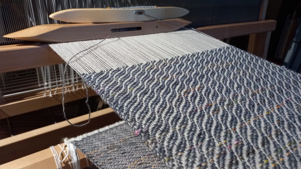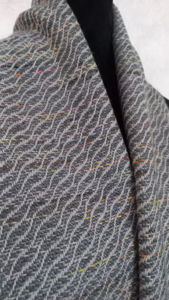 – trame: Mérinos peint à la main tons gris avec touches de couleurs.