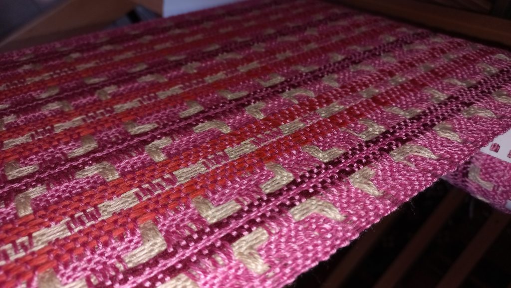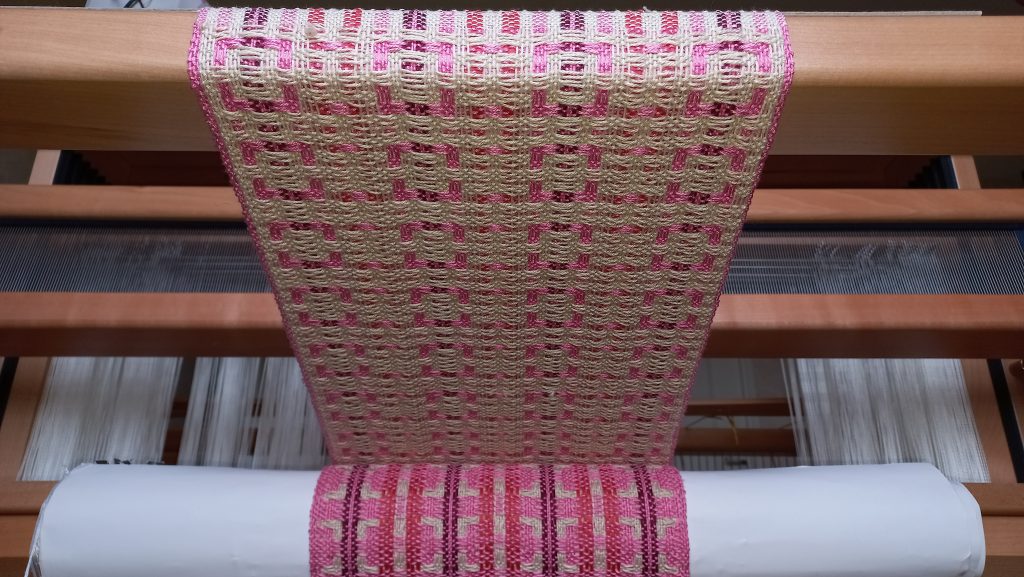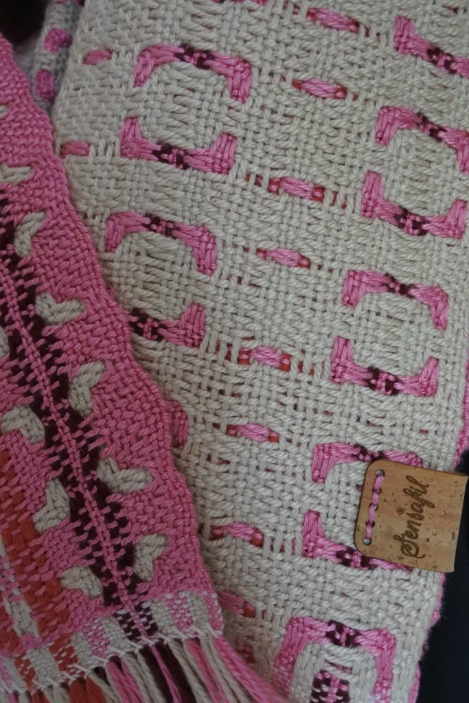 La structure utilisée est un « double tissage » qui a cette particularité de proposer 2 faces complètement différentes l’une de l’autre, imbriquées l’une avec l’autre.